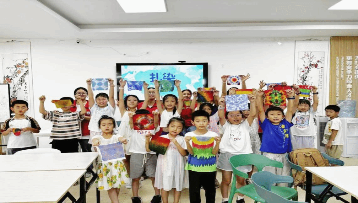兴趣课程凸显文化传承特色。非遗扎染与蜡染体验中,志愿者向孩子们分发丝巾、卡纸等材料,系统教授折叠、染色技巧,当孩子们解开棉线见证图案绽放时,既掌握了传统技艺,更感受了文化魅力。“红色”黏土活动鼓励孩子们发挥想象,创作“国旗花”等爱国主题作品,用鲜红花瓣与黄色五角星诠释家国情怀。植物拓印活动通过展示传统非遗作品,讲述先辈用植物传递消息的革命故事,让孩子们在拓印实践中理解“红色印记”的深刻内涵。