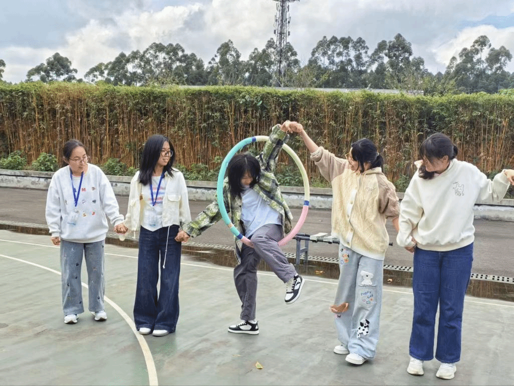 首个项目“一圈到底”率先点燃默契之火。各班10名队员手拉手围成圈,让呼啦圈灵巧穿过每个人的身体。赛场上,有的班级节奏紧凑、行云流水,有的班级虽偶有卡顿却迅速调整,在笑声与鼓励中,同学间的距离悄然拉近。