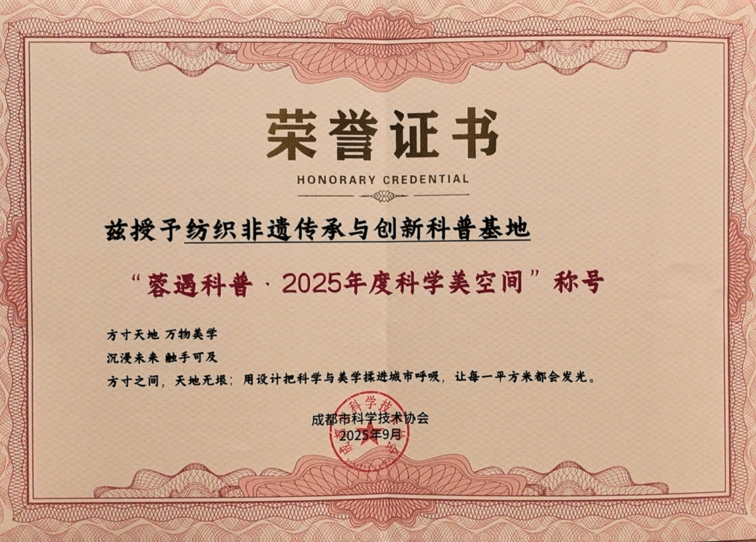 9月4日,成都市科学技术协会发布“2025年蓉遇科普”活动评选结果,在科技处协助下由我校纺织工程学院牵头建设的纺织非遗传承与创新科普基地凭借深厚的文化价值、展陈空间与展品的美学意境、创新的科普模式及广泛的社会影响力,荣获“科学美空间”称号。这一荣誉不仅是对学校在纺织非遗保护与科普教育领域多年深耕的权威认可,更标志着纺织非遗与现代科技深度融合的科普实践迈入高质量发展新阶段。